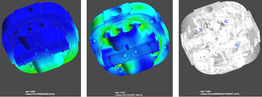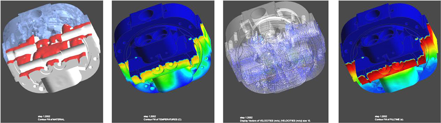 Se realizan simulaciones con el objetivo de optimizar el mejor llenado con la menor colada posible (merma) ademas de obtener las velocidades y presiones optimas para tener una vida de molde lo mas prolongada posible.